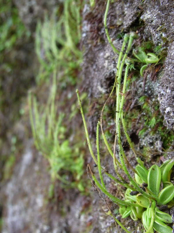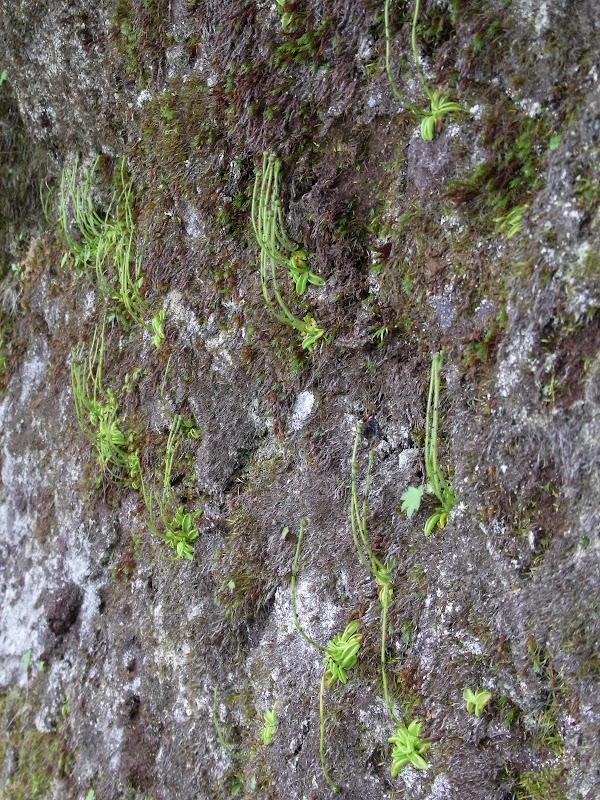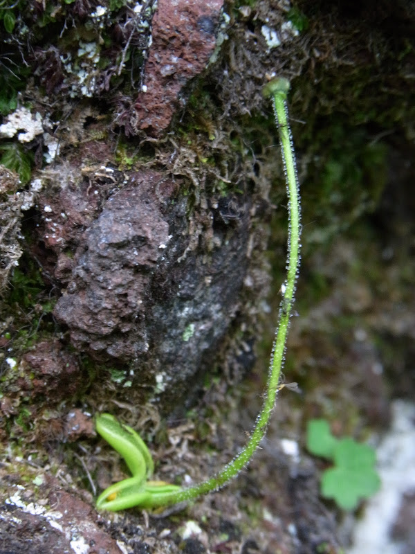 垂直な崖に自生するコウシンソウは、開花後に花茎を反り返るように伸ばし、上部の壁面に種子を押しつけるような状態になります。花の時期には何度か訪れていますが、一度この光景を見てみたいと思っていました。